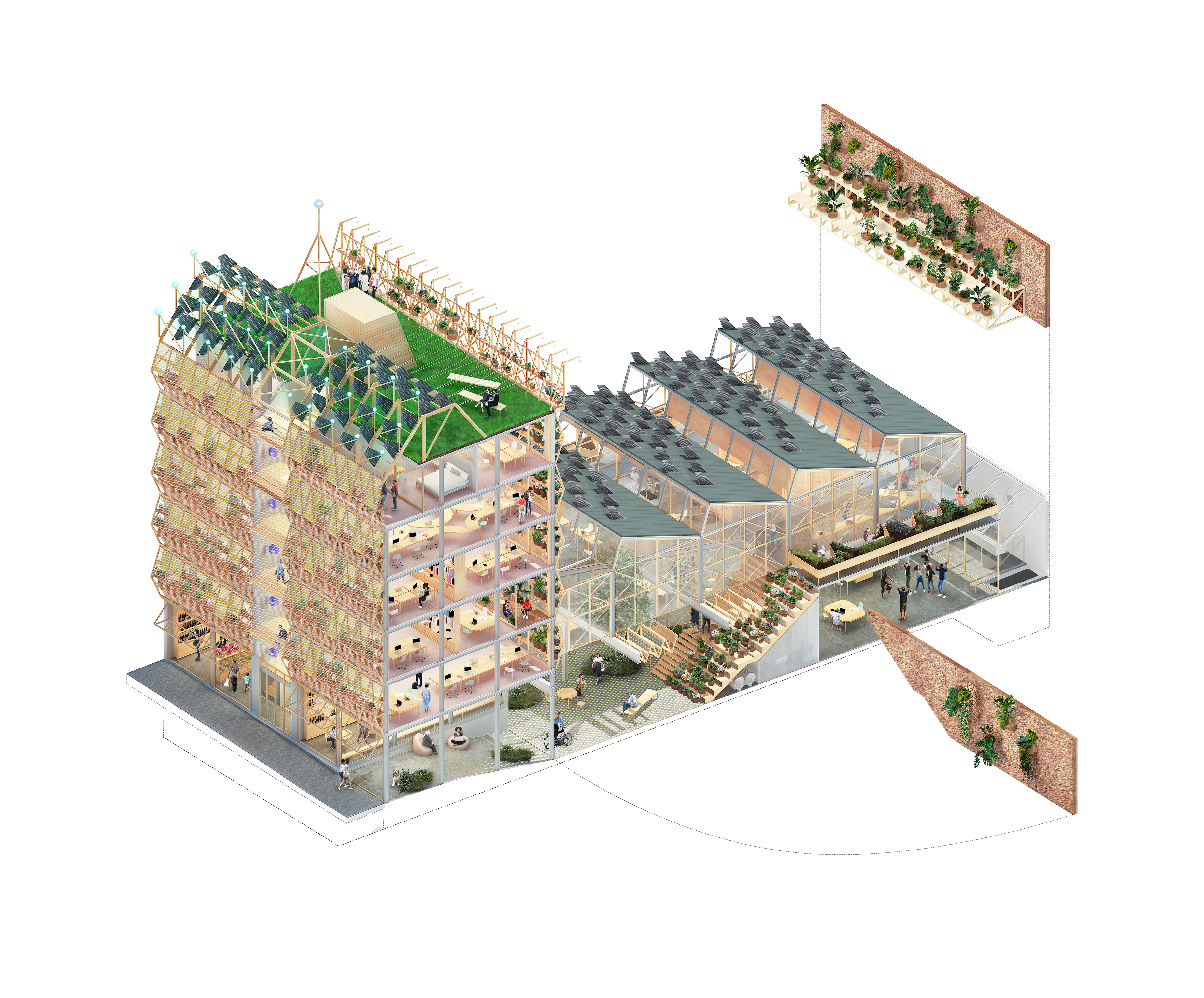 Constructora: Empty / Agronomía y servicios ambientales: con la colaboración de Heliconia / Proyecto de instalaciones, estructuras, bioclimatismo y ACV: Socotec y Aiguasol / Redacción de plan especial y asesoría urbanística: García de los Muros Arquitectos / Asesoramiento inmobiliario y en modelo de negocio: AIGA / Asesoramiento en el desarrollo de la fachada de madera: Grupo Gubia / Colaboradores Husos + elii: Almudena Tenorio, Sem Fernández, Álvaro Garrido, Ciaran Farren, Raquel Peña, Jeremy Schipper, Elena del Cura, Giulia Poma, Elena Taliano, Álvaro Heredia, Aníbal Arenas, Ilaria Sasdelli, Jimena Jaén, João Manfrinato, Teresa Martínez, Lucía Fernández, Ana López, Francisco Toré, Marta Vaquero, Raquel Cano, Gemma Barricarte, Juan Mateos, Mónica Palfy, Stefania Rasile, Sophia Iatrou / Colaboradores Ultrazul: Sebastián Fernández Russomando, Azul Telecom, Nani Moré, Ainhoa Moreno, Lakook-CEAR, Deluz y Compañía, Fôret, Ansón y Bonet, Araceli Jaliff, Antonella Broglia, Larisa Cabañas, Juanito Jones, David Cárdenas, Leyre Romero, María Giselle Pérez, Javier Lorés, Juan Parodi, Irene Zugasti / Imágenes 3D: Bruno Muñoz con Husos + elii / Otros colaboradores: Asesoramiento preliminar ACV: Ecómetro / Fotografías: Impresiones Cotidianas (Juan Asolot) / Agradecimientos: Carlos Almela.