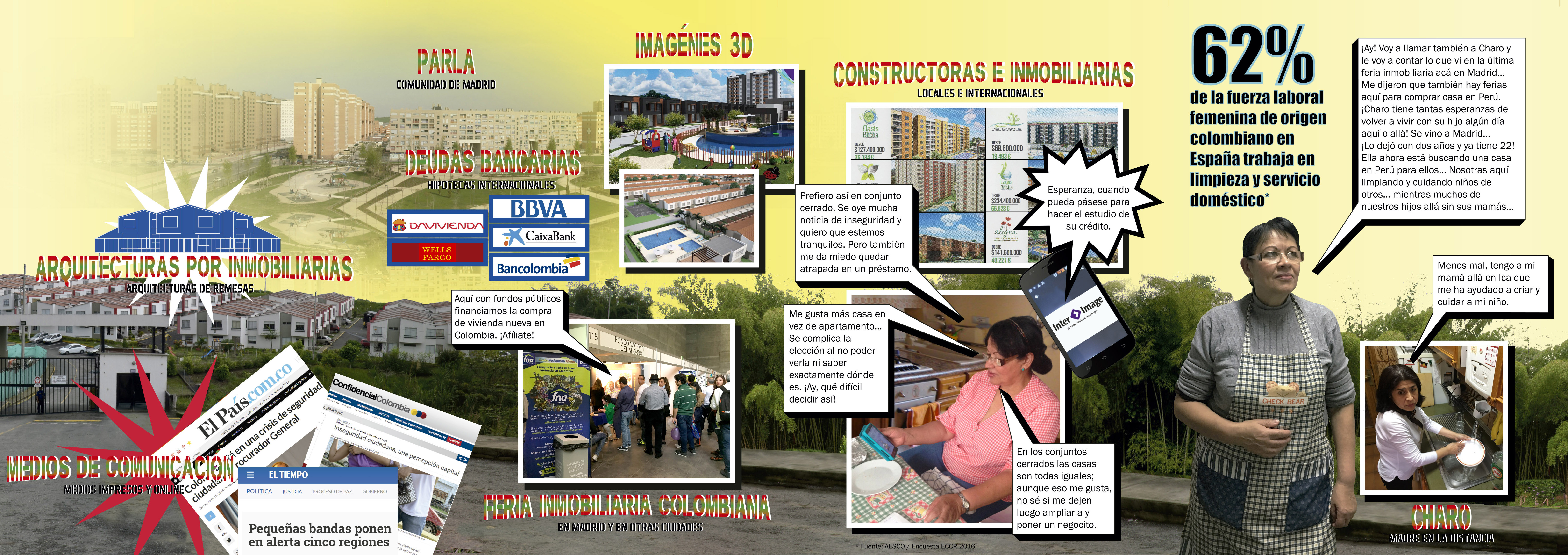 (3) Anuncio de publicidad inmobiliario de periódico dirigido a la diáspora colombiana en Madrid, que ofrece un modelo urbano de comunidades cerradas, formando hileras de viviendas homogéneas. El anuncio presenta una familia blanca y rubia en primer plano, muy diferente de la mayoría de los hogares transnacionales colombianos madrileños, tanto en su aspecto como en la composición de sus miembros. Las familias transnacionales tienen una variedad de configuraciones singulares de miembros dispersos y necesidades específicas. La arquitectura estándar de estas casas no es sensible a estas necesidades.